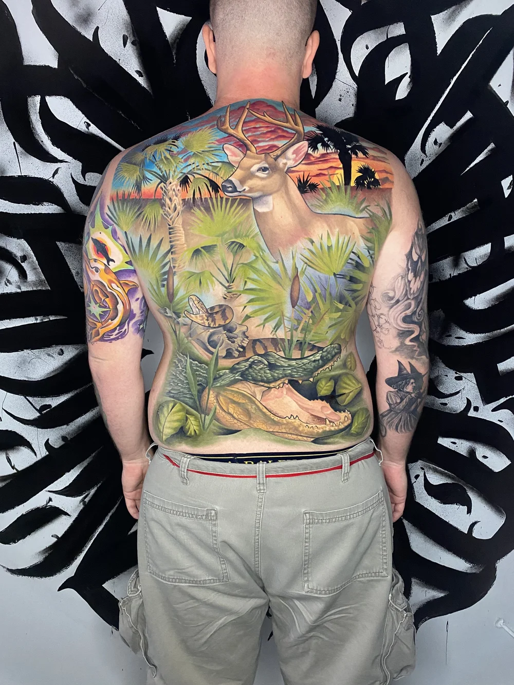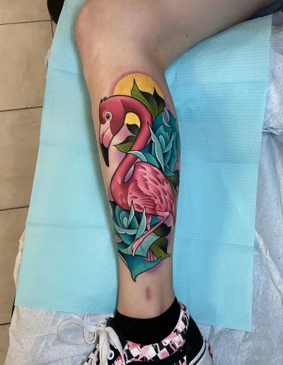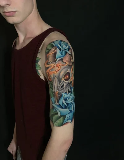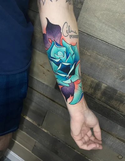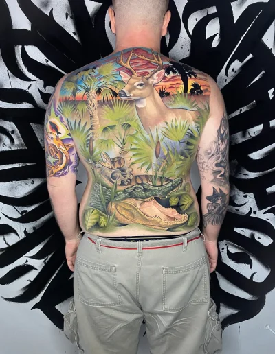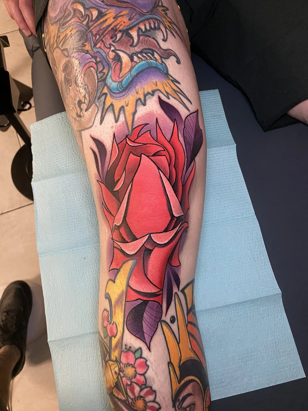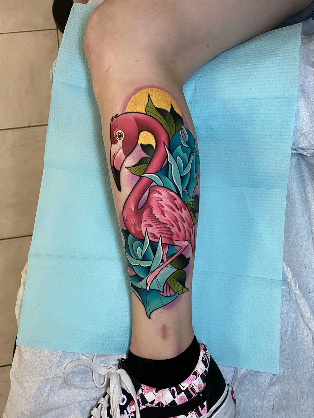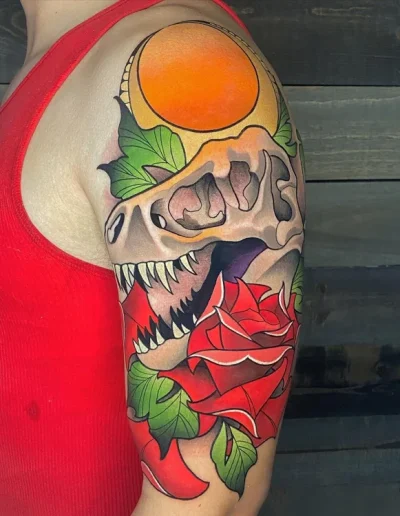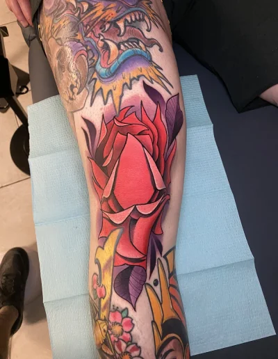 What really gets me excited? Skulls, flowers, and animals—especially pets and Florida wildlife. There’s something special about capturing the personality of someone’s beloved pet or the wild beauty of our local fauna in ink. I love working with bold lines, vibrant colors, and creating pieces that have that perfect balance of playful and striking.